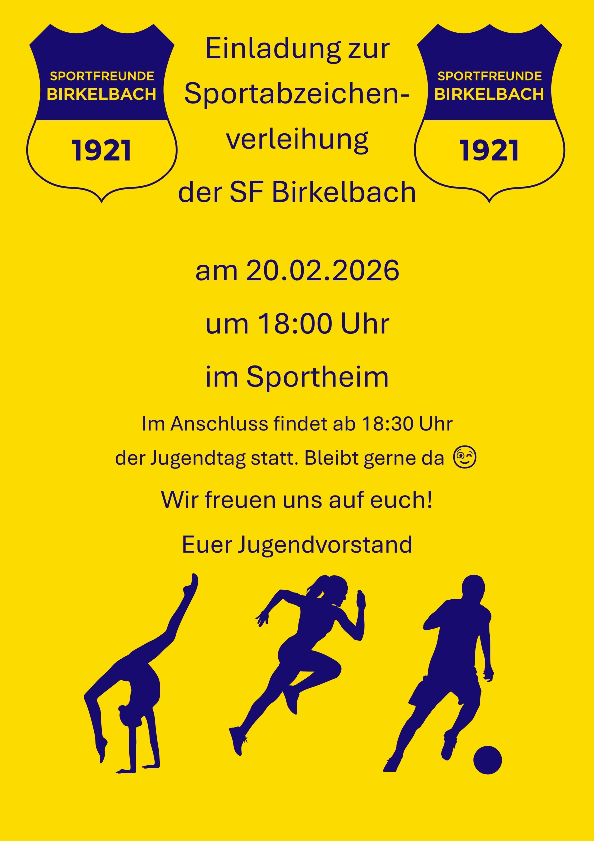 Am Freitag den 20.02.2026 wollen wir um 18:00 Uhr im Sportheim mit der Verleihung starten.